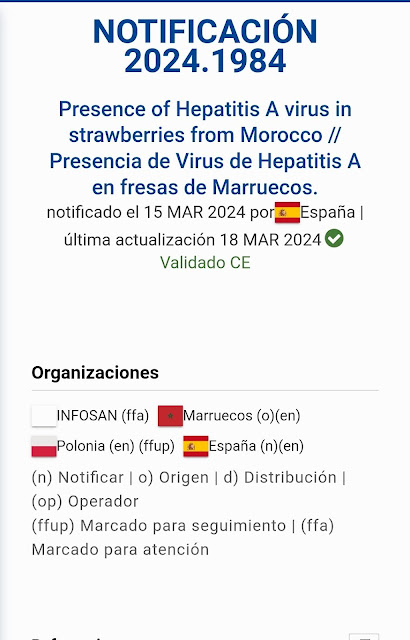 Agricultores españoles vuelven a detectar Hepatitis A en fresas procedentes de Marruecos.